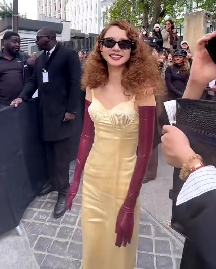 秀场上她身穿黄色缎面吊带裙,胳膊上还戴俩红皮手套,原本很贵气的礼服被衬得有些俗气,瞬间拉低了档次。